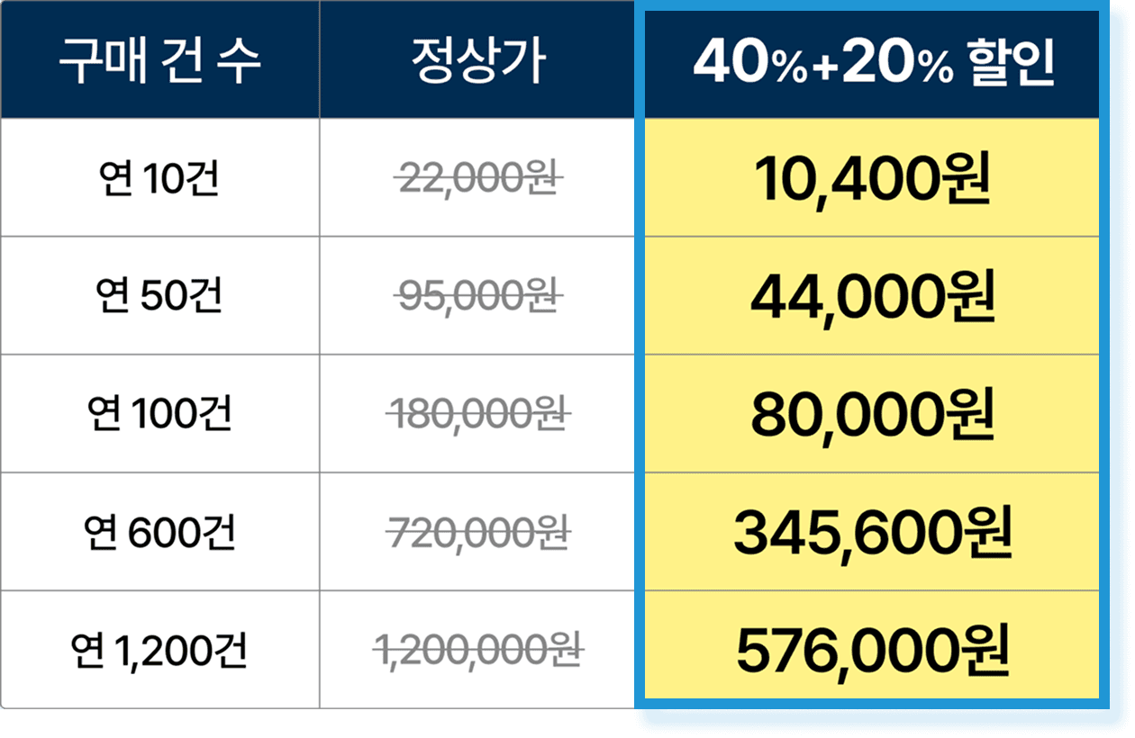 - 할인 받는 방법 : 로그인 → 요금제 구매 → 연 요금 선택 → 건수 입력 → 40% 할인 적용